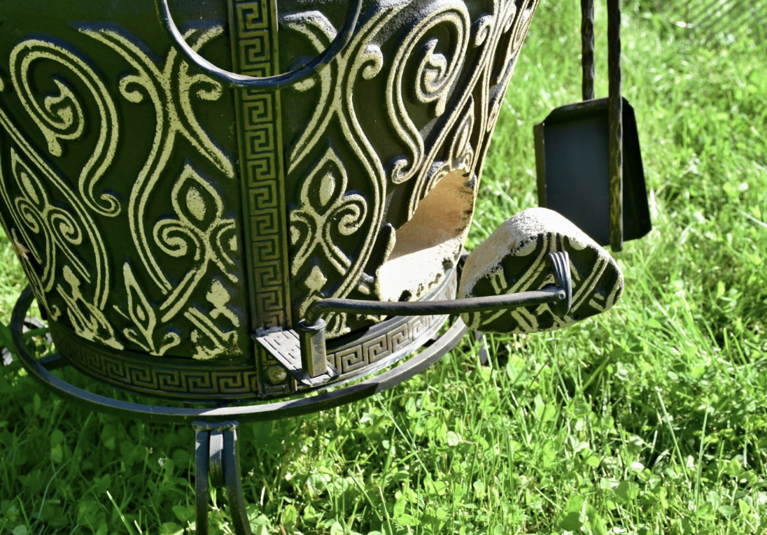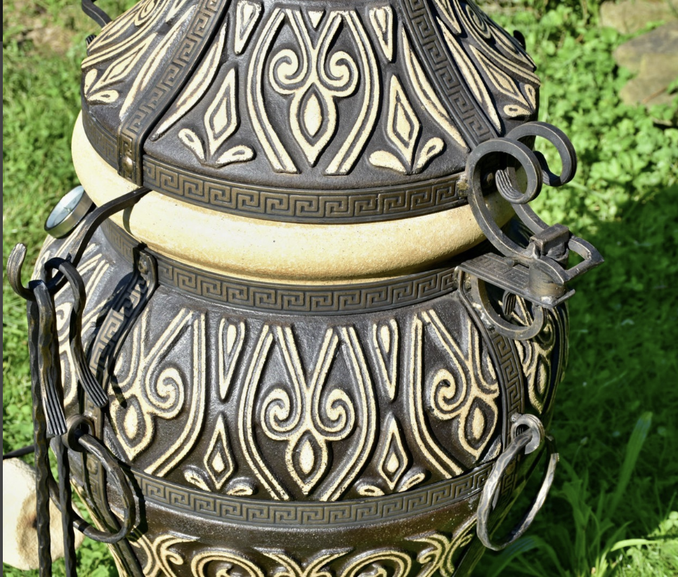 The Large Tandoor Asia GT 100L boasts an aristocratic appearance that can beautifully enhance your garden's ambiance. Crafted from ceramic, this clay oven offers the benefits of healthy and flavorful cooking. With a wall thickness of 8cm, it retains heat efficiently, allowing for prolonged cooking of various foods. It is suitable for preparing meats, fish, baked goods, as well as fruits, vegetables, or mushrooms. This tandoori represents a traditional outdoor clay oven capable of producing a multitude of delectable dishes. Dreaming of baking naan bread in a tandoor? The tandoori clay oven Asia GT makes it possible. It features stylish and robust forged structures that securely encase the tandoor. Each order includes a complimentary set: a lid lifting mechanism for easy handling, a poker, a scoop, a hanging cross for skewers, a set of skewers, and a waterproof dust cover for the tandoor—all for one price.